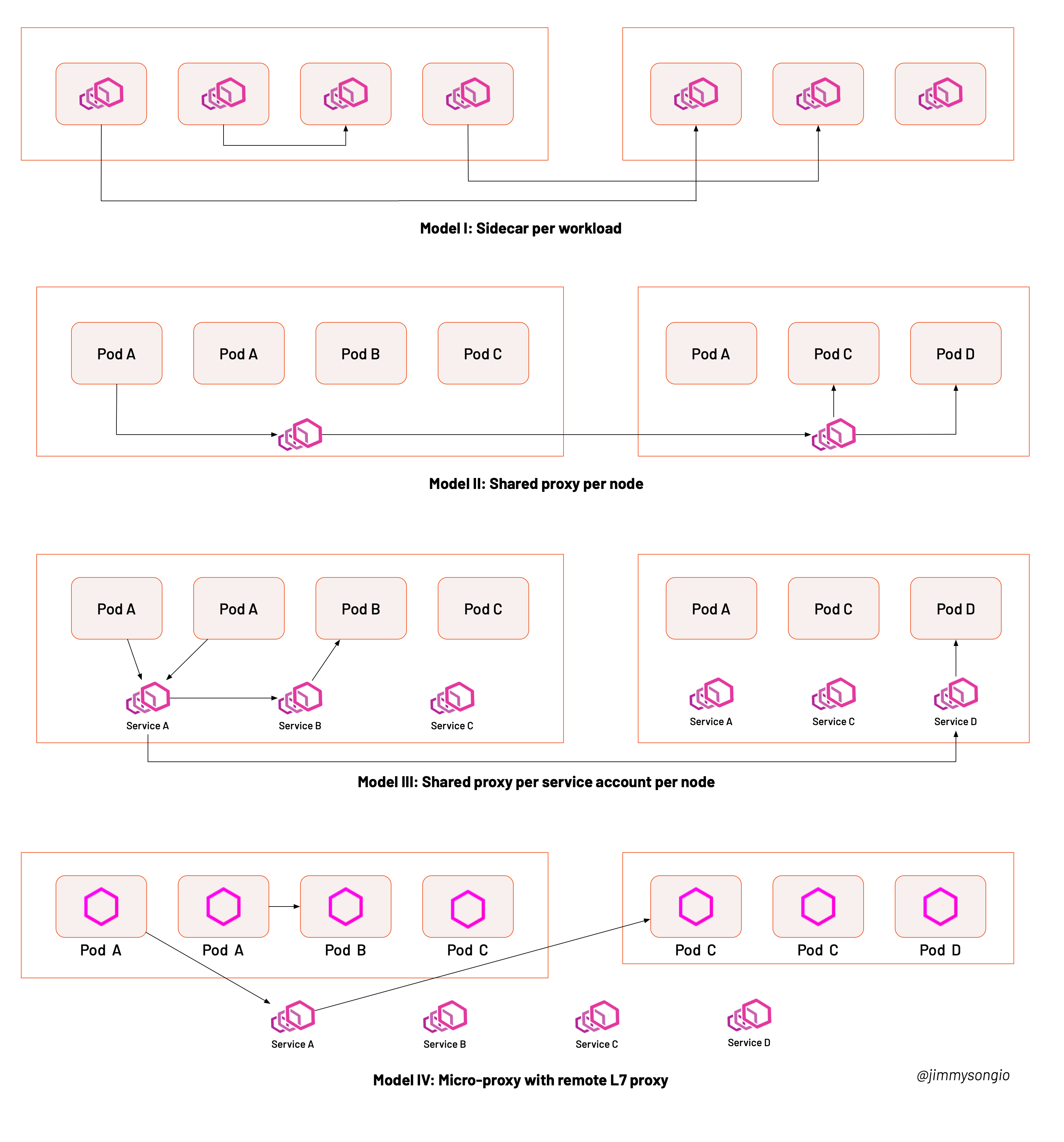 | Service Account/节点共享代理 | 服务账户/身份下的所有工作负载都使用共享代理,开销小。 | 工作负载和代理之间的连接的认证及安全性无法保障。 | 节点和服务账号之间级别隔离,故障同“节点共享代理”。 | 同“节点共享代理”。 |