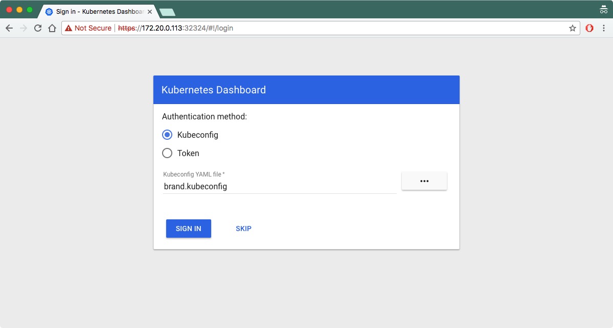 访问集群中的任何一个节点,即可打开dashboard登陆页面,如https://172.20.0.113:32324/(请使用https访问),支持使用kubeconfigtoken两种的认证方式: