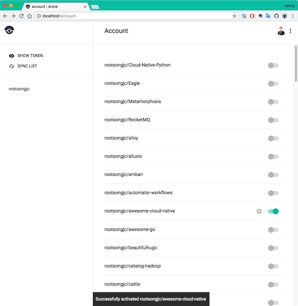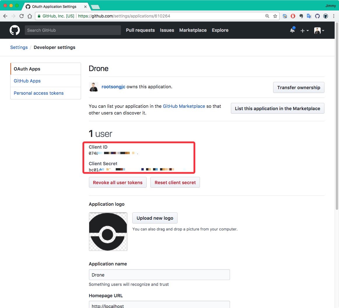 /var/lib/drone是在本地挂载的目录,请确保该目录已存在,且可以被 docker 访问到,Mac 下可以在 docker 的共享目录中配置。DRONE_SECRET可以是一个随机的字符串,要确保drone-server与drone-client的DRONE_SECRET相同。DRONE_GITHUB_CLIENT和DRONE_GITHUB_SECRET即在前面申请的 OAuth 的 Client ID 和 Client Secret。