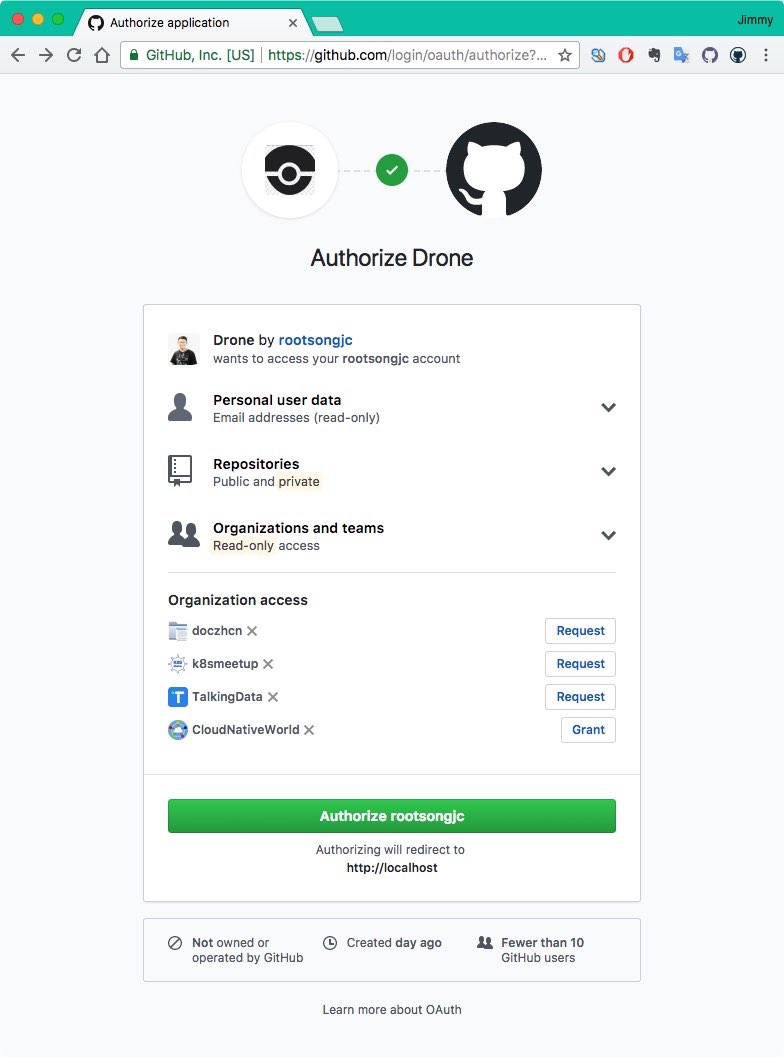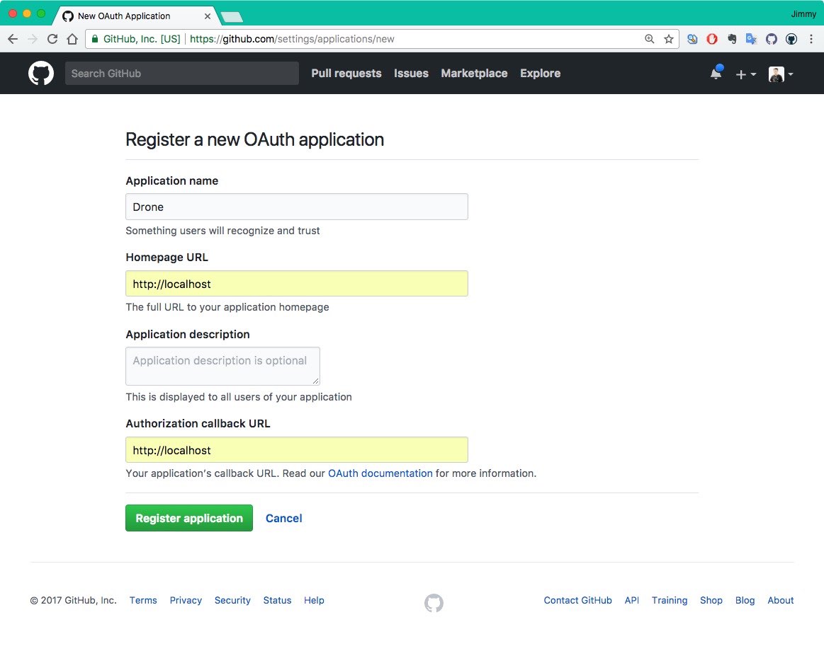 使用 Drone 对 GitHub 上的代码进行持续构建与发布,需要首先在 GitHub 上设置一个 OAuth,如下: