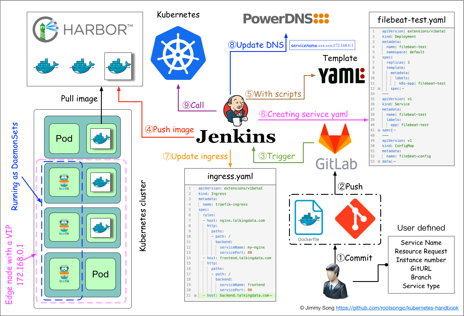 - Jenkins 的 CI 流水线中包括了自定义脚本,根据我们已准备好的 kubernetes 的 YAML 模板,将其中的变量替换成用户输入的选项
