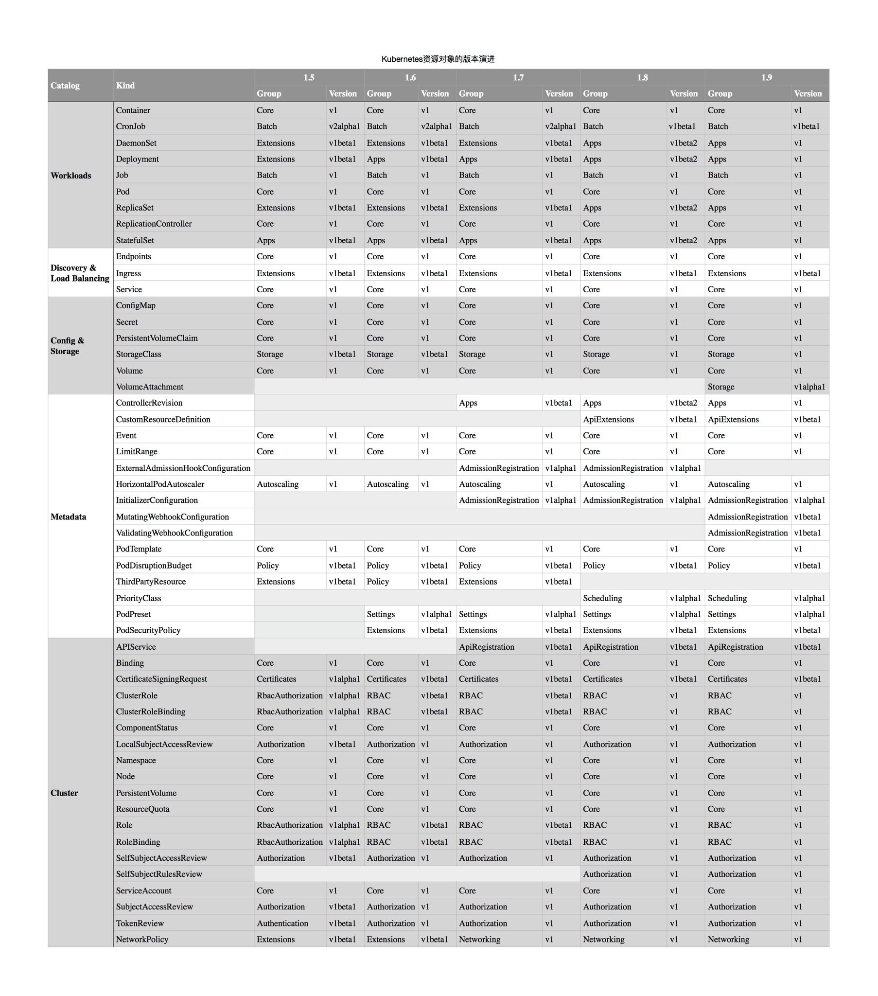 对于不同版本的Kubernetes,许多资源对象的API的版本可能会变更,下表列出了kubernetes1.5至1.9的API资源对象的版本演进: