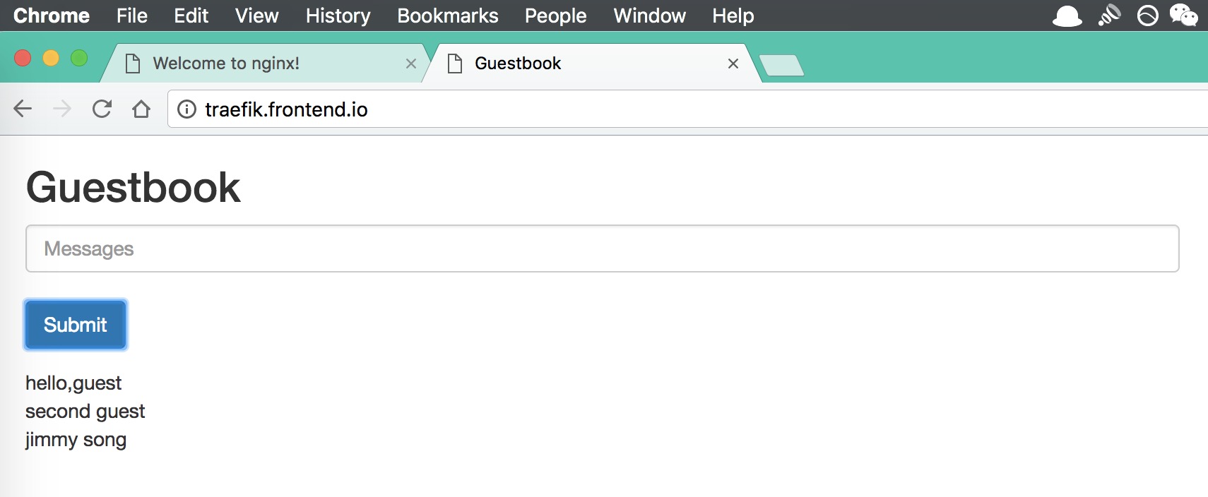修改 hosts 后就就可以在 kubernetes 集群外访问以上两个 service,如下图:
