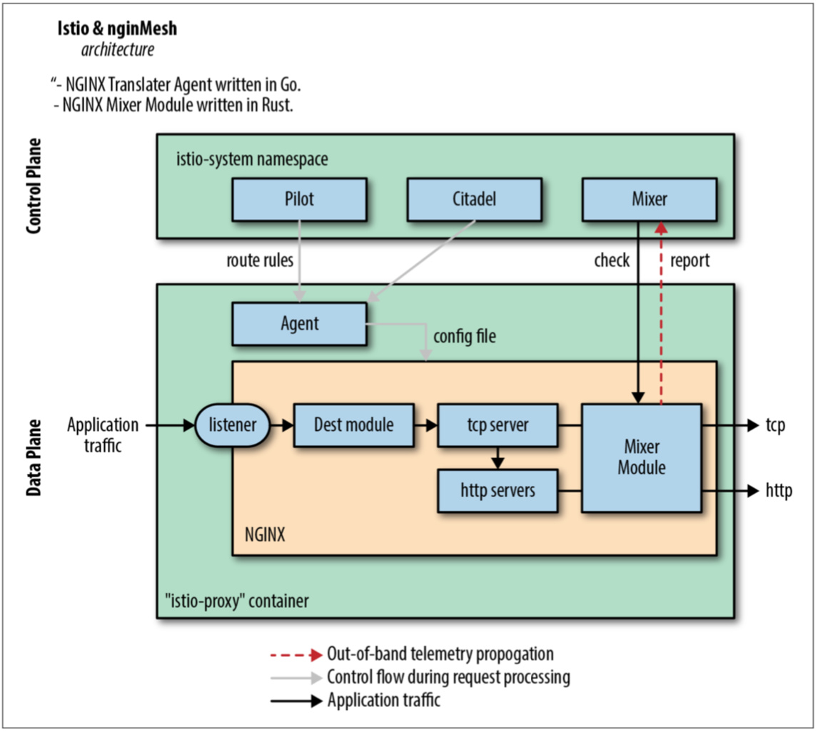 当前可选择的开源的代理可以在 Service Mesh Landscape 里找到,例如使用 nginMesh 替代 Envoy 作为数据平面。下图是使用 nginMesh 作为 sidecar 的架构图。