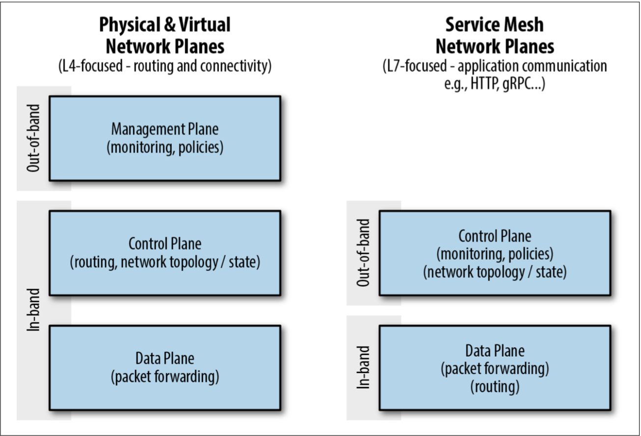 服务网格与传统网络的区别就是硬件或者虚拟网络与软件定义网络(SDN)的区别,我们从上图中可以看到物理和虚拟网络中比起 SDN 还多了 *管理平面*。