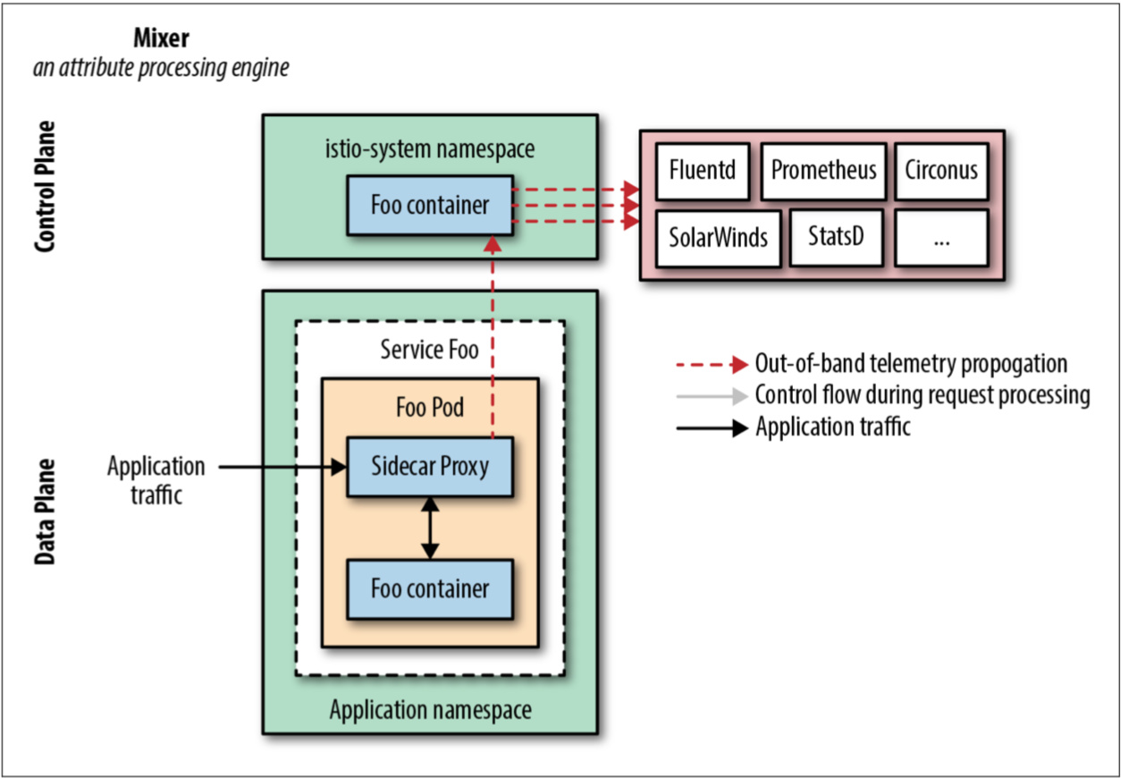 还是拿 Istio 做例子,Mixer(Istio 1.5 之后已从 Istio 内部移除,转而合并到数据平面中) 通过适配器将应用的遥测数据发送给后端监控、日志、认证和份额管理系统。