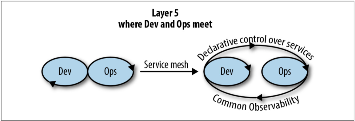 服务网格是在开发和运维之间植入的一个基础设施层。它将服务通信的关注点分离出来,在 TCP/IP 层之上抽象出一层通用功能。服务网格的引入直接导致生产关系的改变进而提高生产效率。具体表现在: